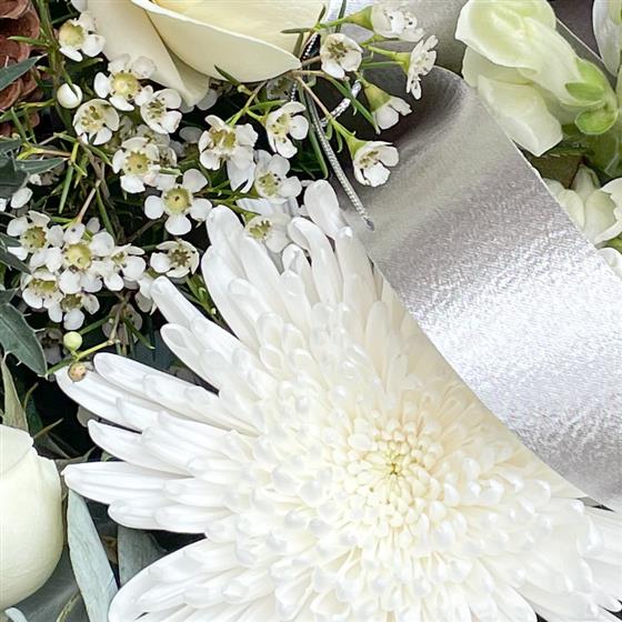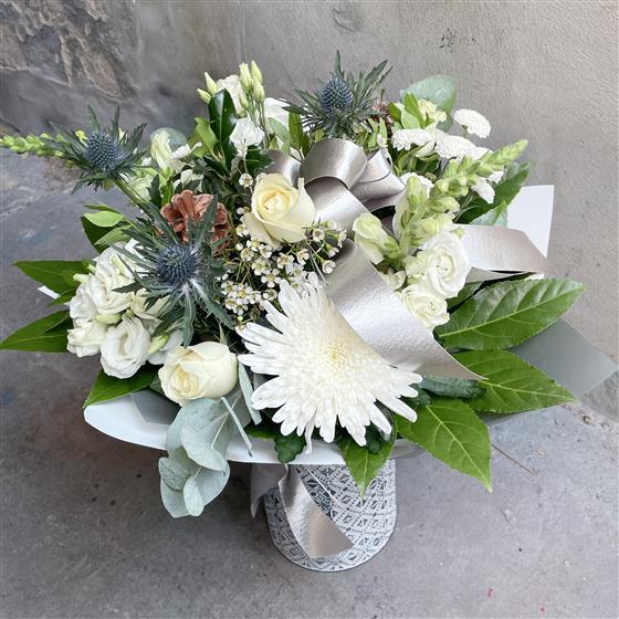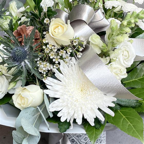 A serene and elegant bouquet, perfect for the Christmas season. This stunning arrangement features a delicate selection of white blooms, including soft roses and eustoma, alongside the striking blue thistle. The addition of natural pine cones adds a touch of rustic charm. All nestled in a classic blue and white milk jug, this bouquet is a timeless piece that will bring peace and beauty to any home.