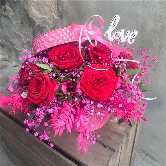 A romantic and compact Valentine’s Day floral arrangement presented in a pink hatbox. This design features 6 premium red roses, arranged with short stems to create a neat, elegant and long-lasting composition. Finished with soft pink gypsophila, decorative foliage, a ribbon and a “Love” topper.