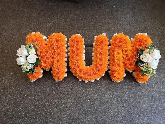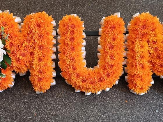 Express your love and respect with our heartfelt Mum's Floral Tribute. Crafted with vibrant orange chrysanthemums and delicate white roses, each letter is a stunning and enduring memorial. At £55 per letter, this personalized tribute is a beautiful way to honor your Mum. Want different colors or lettering? We can customize to your wishes. Let us help you create a lasting remembrance.