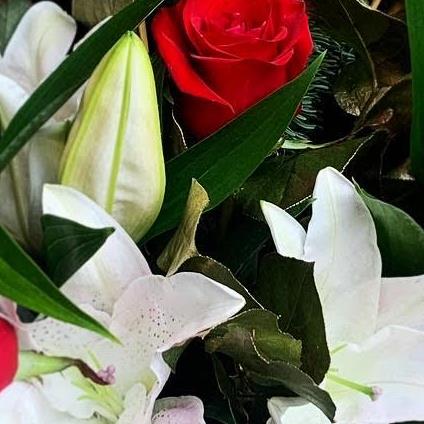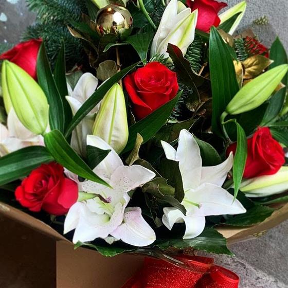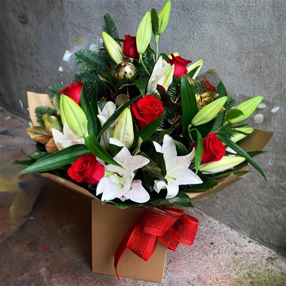 One of our most popular rose and lily bouquet dressed up for festive season.