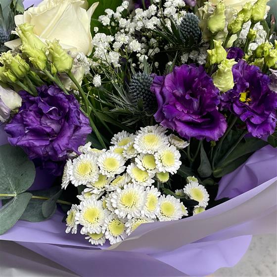 A classic hand-tied bouquet of white roses and purple lisianthus – elegant, fresh and timeless.