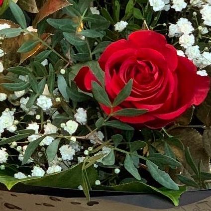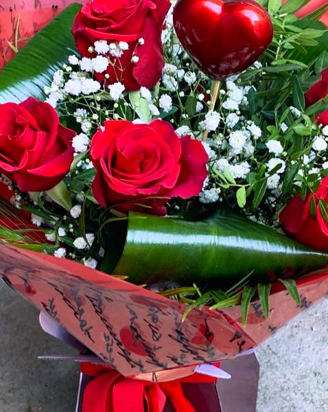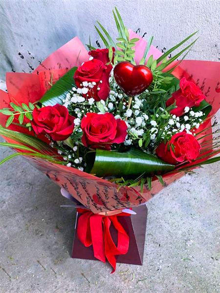 6 Red Roses with complimentary foliage and gypsophila presented in Valentine's themed gift wrap.