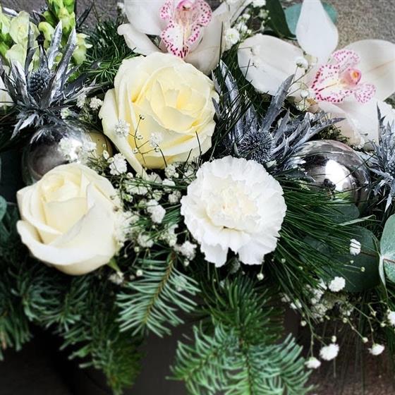 Cymbidium Orchid, Roses, Carnations and Golden Thistles Presented in a Beautiful Hatbox Matched With Beautiful Winter Foliage.