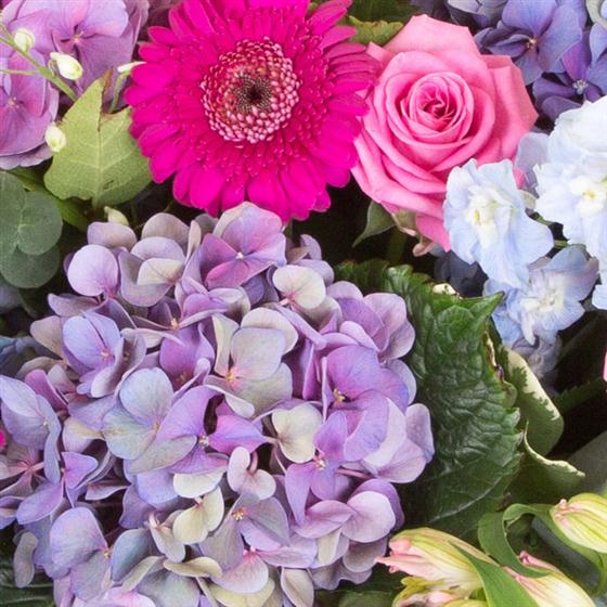 In summer blues, pinks, lilacs, and purples this beautiful spray includes delphinium, hydrangeas, mini gerberas and alstromeria.