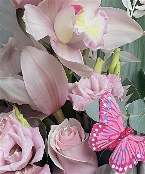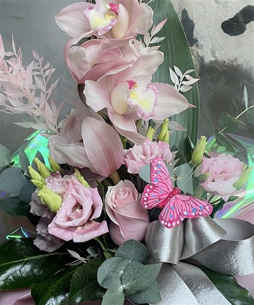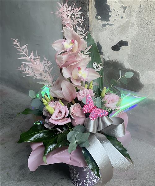 A delicate Mother’s Day floral arrangement featuring elegant pink orchids, soft pastel roses, and fresh greenery. Designed in a decorative keepsake pot and finished with a satin ribbon and butterfly accent, this composition expresses love, gratitude, and tenderness — the perfect gift to make Mom feel truly special.