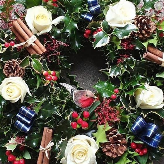 Holly wreath with fresh roses, pine cones, cinnamon sticks, berries and bows.