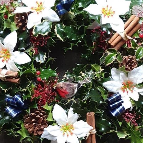Holly wreath with artificial poinsettias, pine cones, cinnamon sticks, berries and bows.